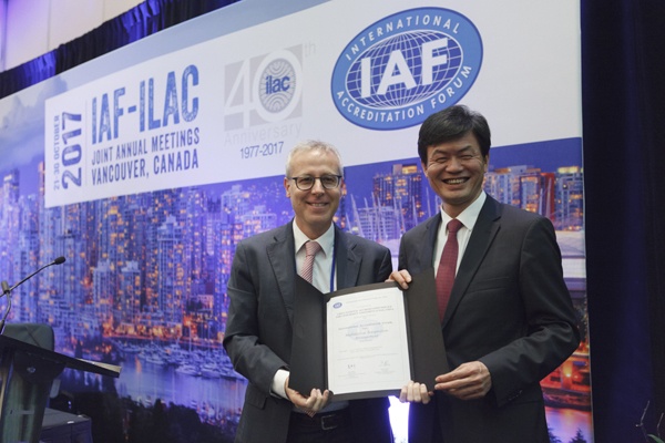 近日,在国际认可论坛(IAF)和国际实验室认可合作组织(ILAC)2017年联合年会上,中国合格评定国家认可委员会 (CNAS)秘书长肖建华代表CNAS与IAF签署了信息安全管理体系多边互认协议,标志着我国的信息安全管理体系认证认可制度正式加入IAF多边互认体系。