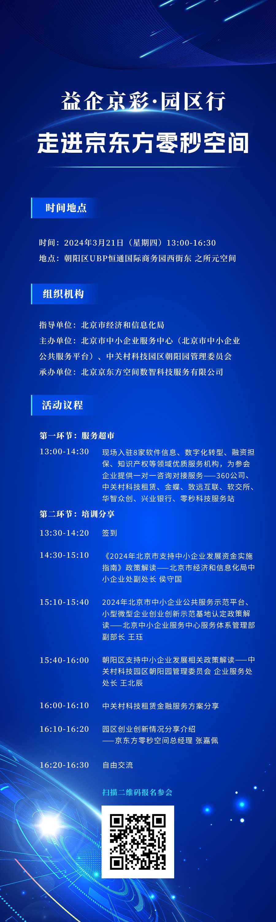 “益企京彩·园区行”——走进京东方零秒空间活动将于3月21日下午开展,现场宣贯解读“2024年北京市支持中小企业发展资金实施指南”